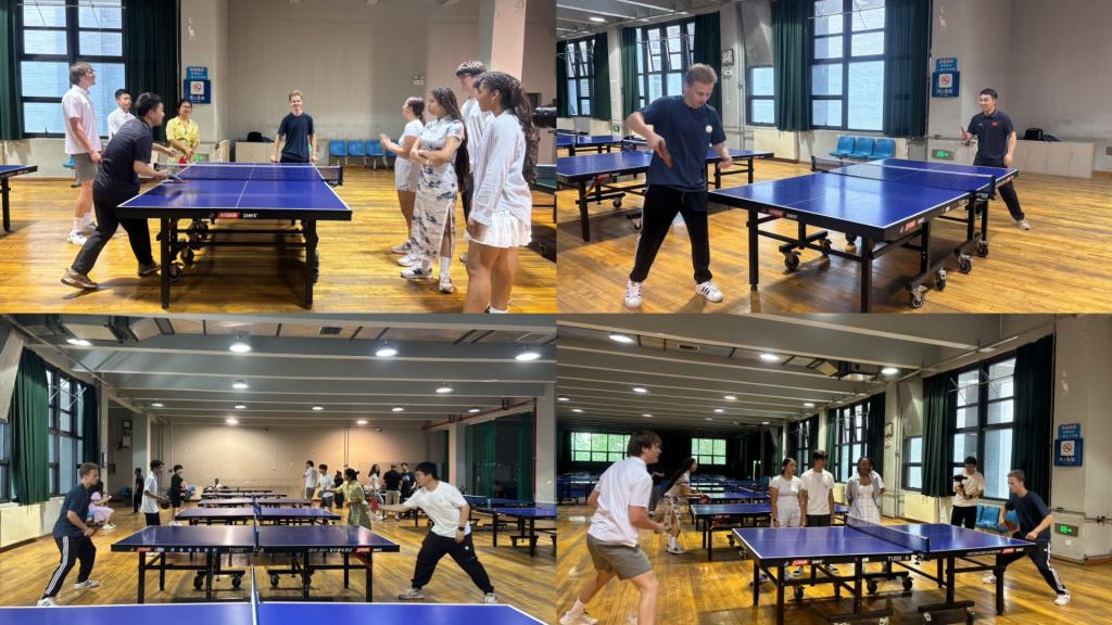 在西安交大文体中心,中美学生跟随体育部何昌珂教练,练习乒乓球发球技术和基本打法,组队展开乒乓友谊交流赛,一起重温历史,感受乒乓外交魅力。