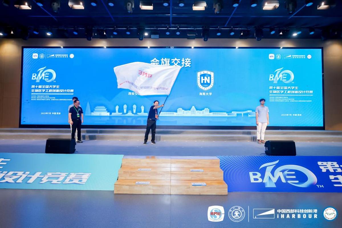 会旗交接环节,西安交通大学生命科学与技术学院院长徐峰教授郑重地将会旗交至第十一届赛事承办方海南大学手中,让生物医学工程青年学子的科创赛事接力传承。