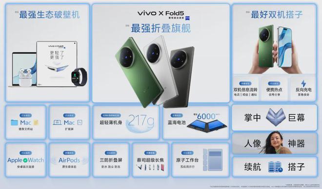 【vivo X Fold5折叠屏手机发布,首发硅负极技术】6月25日,vivo发布新一代折叠旗舰手机vivo X Fold5。据介绍,vivo X Fold5行业首发硅负极技术,搭载等效6000mAh蓝海电池与5000万像素蔡司超级长焦,配备IPX8、IPX9防水等级和IP5X级防尘,机身轻至217g,售价6999元起。(科创板日报)