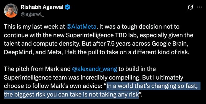 Rishabh Agarwal于今年4月份,以百万美元年薪加入Meta,仅仅五个月后,便闪离了。